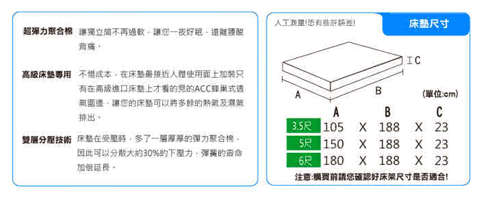 ◆尺寸說明:(高)厚度:23公分?單人加大3.5x6.2尺(105x188公分)?雙人加大6x6.2尺(180x188公分)?標準雙人5x6.2尺(150x188公分)?