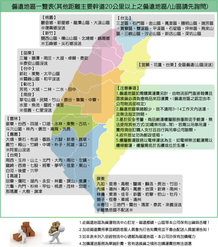 ◆配送範圍:1.如本表未列入但經由物流中心通報為偏遠地區,本公司保有加價權力。 2.加價運送服務為單趟計費,若有退換貨之情形加價運費無法退還。3.臺灣全省西半部主要城市,宜蘭、屏東、花蓮、台東、偏遠地區(台灣本島)需加收運費及離島恕無法服務。 ◆配送說明:3 至 14 個工作天到貨(不包含假日) 。